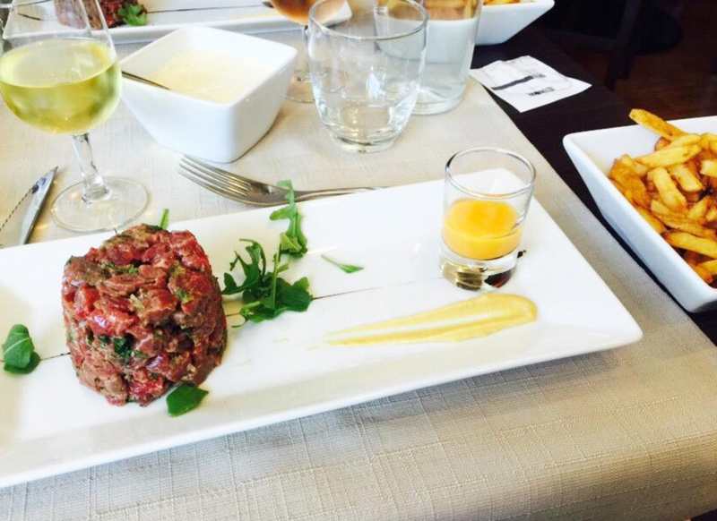 La carte propose 3 formules différentes : formule bistrot, formule déjeuner ou formule gourmande. Les plats proposés à la carte sont variés : salades diverses, pizzas, viandes, pâtes, frites maison... L'établissement offre également un très beau choix de pâtisseries et desserts maison : tiramisu, fondant au chocolat, tarte au citron meringuée... Les plats sont très joliment présentés.