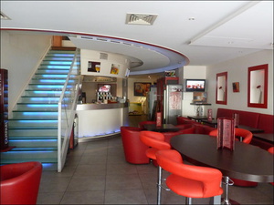 Enfin le bar, pour le café du matin, une glace, un rafraîchissement ou un cocktail, fait varier l'ambiance selon l'heure de la journée. En soirée, la luminosité de la salle cède la place à une atmosphère tamisée et chaleureuse, aux jeux de lumières du bar, de l'escalier et à la musique.