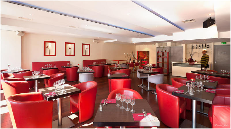 Trois ambiances pour un même Opus. A l'étage, les tables espacées, les fauteuils de cuir rouge et le mur de pierres créent une atmosphère apaisante et sereine. Convivialité et calme sont en rendez-vous, avec en prime la vue de prestige sur la place et le Musée des Beaux Arts.